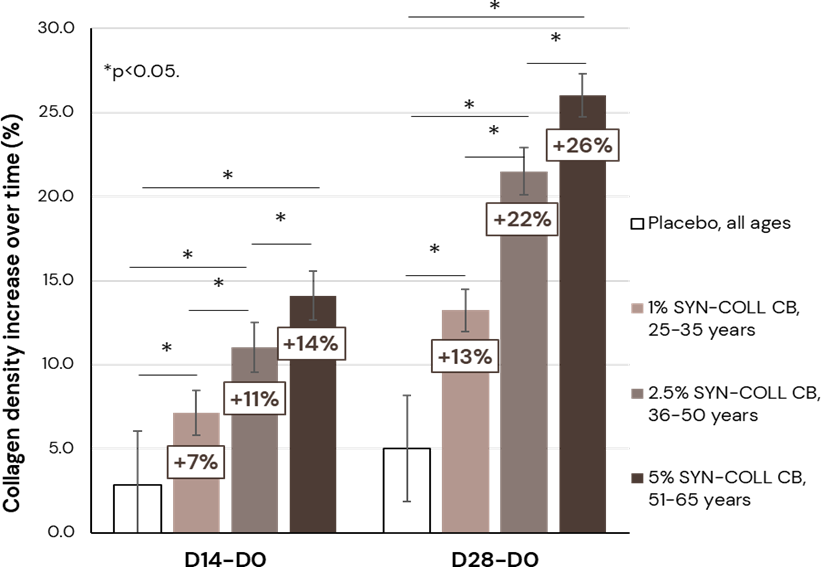 New data extend its profile as a life-course collagen modulator. In a 28-day facial study, female volunteers were stratified into young (25–35 years), middle-aged (36–50 years) and mature (51–65 years) cohorts (n = 25 per cohort, phototypes II–V, mixed ethnicities), alongside a placebo group (n = 30). Age-adapted SYN®-COLL CB concentrations (1%, 2.5%, 5%) were applied twice daily to the full face and neck. High-frequency ultrasound at multiple facial sites showed statistically significant increases in collagen density versus age-matched placebo in all