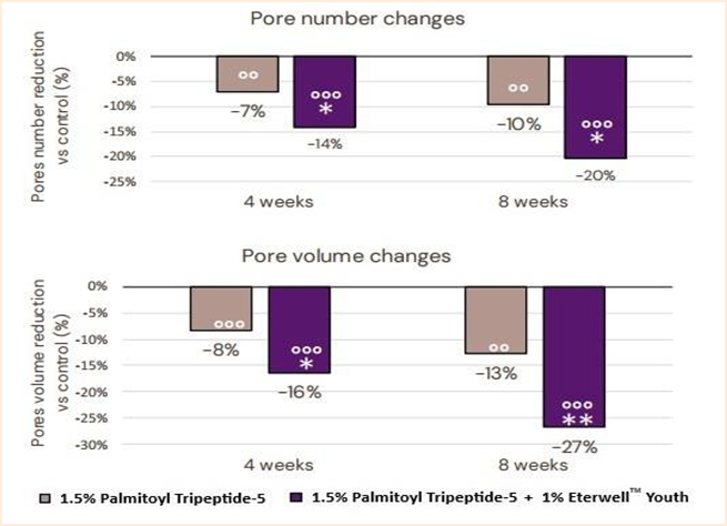 Figure 5: The test product with Palmitoyl Tripeptide-5 alone produced significant improvement in pore number and volume (-7% and -8% respectively), when compared to the untreated skin. However, as with collagen density, these improvements were boosted when 1.5% Palmitoyl Tripeptide-5 was combined with 1.0% ETERWELLTM YOUTH.