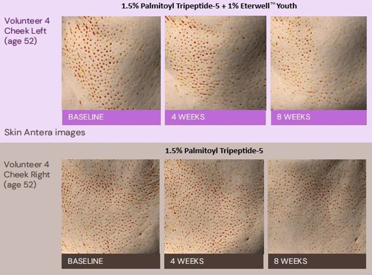 The senolytic-peptide concept was clinically tested in a two-month, single-blind, randomized, half-face study in 55 Chinese women aged 45–65 years. Each volunteer applied a formulation containing 1.5% Palmitoyl Tripeptide-5 to one hemiface and an otherwise identical formulation with 1.5% Palmitoyl Tripeptide-5 plus 1.0% ETERWELLTM YOUTH to the contralateral side, twice daily. Ultrasound measurements showed that while the peptide alone significantly increased collagen density relative to untreated skin, the combination with ETERWELLTM YOUTH produced approximately a 200% greater increase.
