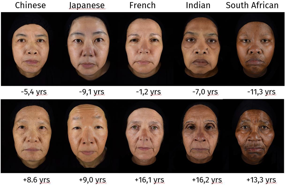 Figure 1. Differences between estimated and chronological age in women aged 50-65 years across five ethnic groups. Women in each column have the same chronological age, with numbers showing how many years older (+) or younger (-) they were perceived compared to their actual age